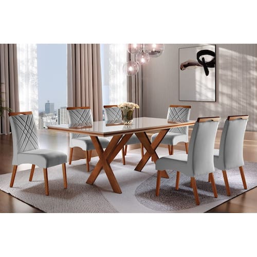 Sala de Jantar Madeira Maciça com 6 cadeiras 1,80x1,0m - Jade - Requinte Salas   A mesa de jantar Nobre tem um design individualizado, que une modernidade, beleza e sofisticação, produzida com os materiais da mais alta qualidade para atender bem os seus usuários. Ela tem a estrutura da base em madeira maciça Tauari, ecologicamente correta, o tampo em MDF 45mm de espessura, vidro de 3mm sobreposto, e quinas canto tick que traz uma modernidade a mais. Um escândalo de elegância junto das cadeiras Alfa! As cadeiras Alfa esbanjam elegância e charme para deixar sua sala de jantar completa e moderna! Elas contam com um encosto todo estofado com detalhes em costura, e um pegador em madeira maciça, que proporcionam um charme a mais a esse modelo. O assento é fabricado com espuma de densidade D-23 e D-20 no encosto, reforçando o conforto do produto. Sua estrutura é toda em madeira maciça tauari, ecologicamente correta. Perfeitas, não é mesmo? Aproveite!   Fazem parte do anúncio 1 Mesa de Jantar Nobre 6 Cadeiras Alfa Obs. Objetos de decoração não inclusos.   Particularidades da Sala de Jantar  Características da Mesa: - Base em madeira maciça Tauari seca em estufa e imunizada - Madeira ecologicamente correta - Tampo em MDF com 45mm de espessura - Vidro 3mm - Tampo retangular com quinas retas   Características da Cadeira: - Madeira Tauari seca em estufa - Madeira imunizada - Espuma D-23 no assento - Espuma D-20 no encosto - Estrutura reforçada - Ecologicamente correta - Peso suportado 150kg   Dimensões da Mesa: Altura: 76 centímetros Largura: 1,80 metros Profundidade:1 metro   Dimensões da Cadeira: Altura: 1 metro Largura: 47 centímetros Profundidade: 54 centímetros   Informações Importantes: - Produtos podem apresentar diferenças de tonalidades entre a foto na tela e o produto real, devido a calibração de cor de tela.   - Limpar com flanela ou pano macio. Não utilizar álcool. Não utilizar produtos abrasivos ou corrosivos - Nós prezamos pela qualidade da entrega em primeiro lugar, trabalhamos com transportadoras altamente selecionadas e os melhores materiais de embalagem. - Todos os itens já vão embalados, a mesa vai semi montada e as cadeiras 100% montadas. Não necessita da montagem de um profissional, ficando ao critério do cliente. Não nos responsabilizamos pela montagem. - Objetos de decoração não incluso. - Certifique-se de que o produto caiba em elevadores e vãos de escadas, não fazemos içamentos ou desmontagens de produtos. Quaisquer despesas deste tipo ficam a cargo do cliente - Garantia de 3 meses contra defeitos de fabricação.
