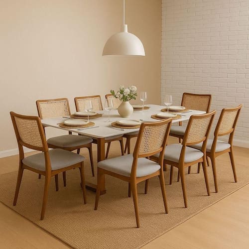 Tenho certeza que você vai se encantar com esta linda mesa de jantar! A Mesa Talia é o produto delicado e luxuoso que faltava na sua casa. A base de sua mesa é fabricada em 100% madeira maciça trazendo uma durabilidade maior, madeira é ecologicamente correta e sustentável, seu tampo é de MDF laqueado e com quinas arredondadas e vidro serigrafado 4mm sobreposto. As Cadeiras Zara possuem um design moderno e um acabamento muito delicado, que vai trazer ao seu ambiente um ar sofisticado e elegante! As cadeiras tem a estrutura em madeira maciça tauari, madeira ecologicamente correta, e o seu encosto é fabricado em fibra de rattan natural (telinha). Quanto a durabilidade, esse modelo não deixa nada a desejar, o seu assento é fabricado com espuma de densidade D-26, muito confortável, e as cadeiras suportam ate 150Kg distribuídos. Ideal para compor salas de jantar sofisticadas, essa cadeira une durabilidade, ergonomia e um design versátil que harmoniza com diversos estilos de decoração.