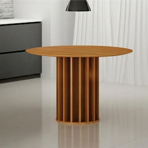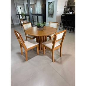 Sala de jantar redonda 4 lugares Florença - Arbo Design\nA Sala de Jantar Florença é o que você precisa para receber os amigos e família de forma prática e agradável. Além de linda, essa sala traz um conforto inenarrável que com certeza todos irão amar! Confira e aproveite!\nFaz parte do anúncio: 1 Mesa  1,08m 4 cadeiras \nObs. Objetos de decoração não inclusos\nParticularidades da Mesa: Características: - Desing moderno; - Estrutura e tampo em MDF; - Estilo ripado\nParticularidades da Cadeira: Características: - Desing super moderno; - Estrutura em MDF; - Base assento em MDF estofado; - Espuma D20 \nDimensões da Mesa: Altura: 75 centímetros Diâmetro:1,08 metros\nDimensões da Cadeira: Altura: 90,centímetros Largura: 45 centímetros Profundidade: 51 centímetros\nInformações Importantes:. - Produtos podem apresentar diferenças de tonalidades entre a foto na tela e o produto real, devido a calibração de cor de tela. - Limpar com flanela ou pano macio. Não utilizar álcool. Não utilizar produtos abrasivos ou corrosivos. - Nós prezamos pela qualidade da entrega em primeiro lugar, trabalhamos com transportadoras altamente selecionadas e os melhores materiais de embalagem. - A montagem é de total responsabilidade do comprador. Antes de comprar, verifique o espaço disponível para a montagem. - Certifique-se de que o produto caiba em elevadores e vãos de escadas, não fazemos içamentos. Quaisquer despesas deste tipo ficam a cargo do cliente.