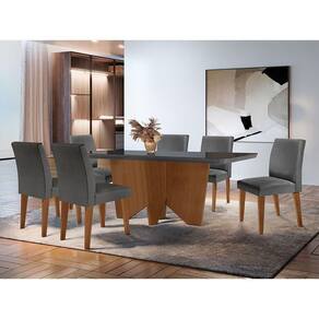 Sala De Jantar Mesa Evora Canto Copo 6 Cade. Grecia Rufato Linho Grafite E Imbuia Para trazer mais beleza, conforto e sofisticacao a sua sala de jantar ou cozinha, a escolha perfeita e o Conjunto Evora com 6 cadeiras Grecia A mesa e retangular, muito espacosa, comporta de maneira confortavel seis pessoas. Possui tampo com acabamento Uv e vidro serigrafado/temperado de 4mm, que trazem mais durabilidade para seu produto. Ja as cadeiras do conjunto possuem espuma de alta densidade proporcionando ainda mais conforto para seus amigos e familiares. Que tal renovar sua casa com todo conforto e beleza do Conjunto Evora? Garanta ja o seu! Caracteristicas: Material: 100 MDF Tampo com vidro temperado 4mm Canto Copo