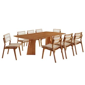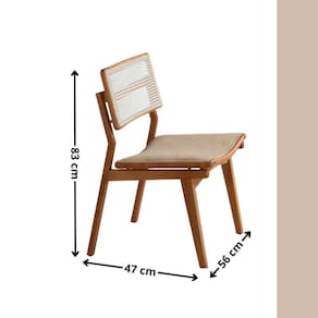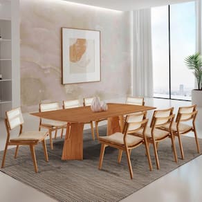 As Cadeiras Eva Premium sao produzidas em madeira macica, trazendo robustez e sofisticacao. O encosto em ratan natural imprime leveza e charme artesanal, enquanto os assentos estofados proporcionam uma experiencia de conforto superior - perfeitos para longas refeicoes e momentos especiais.