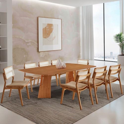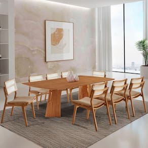 As Cadeiras Eva Premium sao produzidas em madeira macica, trazendo robustez e sofisticacao. O encosto em ratan natural imprime leveza e charme artesanal, enquanto os assentos estofados proporcionam uma experiencia de conforto superior - perfeitos para longas refeicoes e momentos especiais.