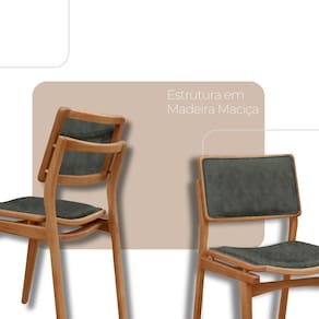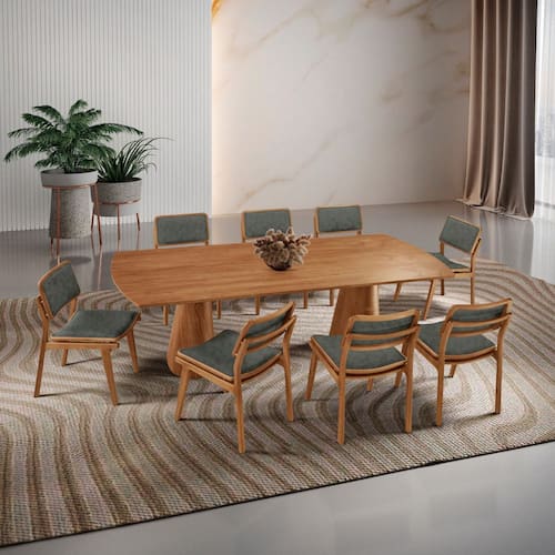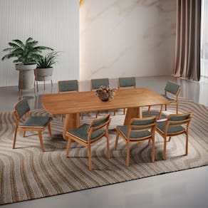 As cadeiras Eva complementam esse conjunto com um toque ainda mais natural. Feitas em madeira maciça e cuidadosamente estofadas no assento e encosto, proporcionam o equilíbrio perfeito entre conforto e design. Seu formato envolvente acolhe e convida a desfrutar de momentos inesquecíveis ao redor da mesa.
