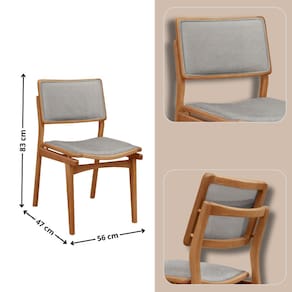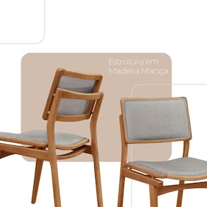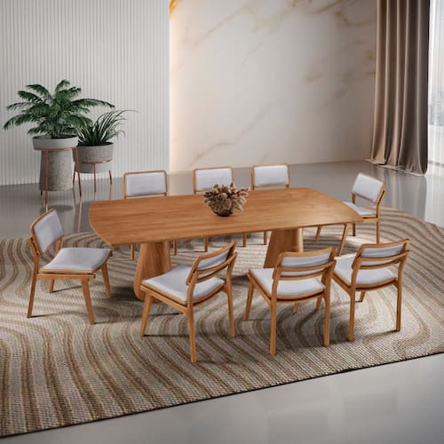 As cadeiras Eva complementam esse conjunto com um toque ainda mais natural. Feitas em madeira maciça e cuidadosamente estofadas no assento e encosto, proporcionam o equilíbrio perfeito entre conforto e design. Seu formato envolvente acolhe e convida a desfrutar de momentos inesquecíveis ao redor da mesa.