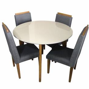 Estrutura: Tampo de MDF de 25 mm espessura com vidroFormato: Tampo redondo na cor OFF WHITEVidro: Sim, temperado com espessura de 3 mmAcabamento: Pintura U.V de alta resistênciaPés: Sim, em madeira maciça com suporte dos pés em metal e sapata antiumidade nos pésCadeira