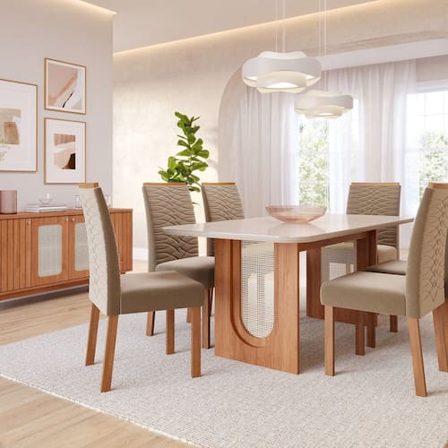 A base da Mesa Valentina é uma obra de arte por si só. Feita de MDF, proporciona estabilidade excepcional, enquanto o detalhe em tela sintética adiciona um elemento de textura e elegância. O tampo de vidro temperado confere um toque de modernidade e leveza. Além de ser visualmente impressionante, o vidro temperado oferece robustez e segurança. O assento e o encosto da cadeira são revestidos com estofamento de alta qualidade, proporcionando uma experiência de conforto excepcional. A inovação da Clarice também se estende ao seu sistema de facil montagem. Medida da Mesa (A x L x P): 76cm x 90cm x 180cm Peso da Mesa: 66,72 kg Mesa suporta até: 40.0000 Acabamento da Cadeira/Banco: Verniz Natural Acabamento da Mesa: Pintura UV Acompanha Manual de Instalação: Sim Almofada do assento: Fixa Ambiente Principal: Sala de Jantar Cadeira/Banco Estofada: Encosto e Assento Estofados Cadeira/Banco estofada: Encosto e Assento Estofados Cadeira/Banco suporta até: 100.0000 codigo_ean: 7900288029430 Complexidade da Montagem: Média: pode ser montado por mais de uma pessoa e/ou necessite de maior conhecimento para montagem Cor: Cinamomo/ Off White/ Madeira/ Joli Cor do Produto: Cinamomo/ Off White/ Madeira/ Joli Cor do Tampo: Bege Cor Secundária: Bege De Canto (Canto Alemão): Não Enchimento do Assento: Espuma D-20 Enchimento do Encosto: Espuma D-18 Escala de Brilho: Semi-Brilho Espessura do Tampo: 29 mm Formato do Tampo: Retangular Itens Inclusos: 1 Mesa e 6 Cadeiras Manual de Montagem e Instalação: https://product-hub-prd.madeiramadeira.com.br/971009/documents/b1a26909-f99d-4d60-9c49-9b6263d95d452575895503517335066858875.pdf Marca: Cimol Material da Base da Mesa: MDF Material da Estrutura da Cadeira: Madeira Material do Tampo: MDF/Vidro Medida da Cadeira/Banco (A x L x P): 99cm x 46cm x 57cm Medida do Tampo (L x C x E): 90 x 180 x 2,9 Mesa Extensível: Não Necessita Montagem: Sim Origem do Produto: Nacional Peso da Cadeira/Banco: 9 kg Possui Apoio Para os Pés: Não Possui Suporte Giratório: Não Possui Vidro: Sim Quantidade de Cadeiras: 6 Quantidade de Lugares: 06 Recomendações de Uso, Manutenção e Limpeza: Para manter seu móvel novo por muito mais tempo, evite locais úmidos, mantenha-o distante de líquidos. Para limpá-lo com segurança utilize uma flanela seca sem produtos abrasivos Revestimento da Cadeira/Banco: Suede Sistema de Montagem: Parfuso, porcas e cavilhas. Tipo de Encosto: Estofado