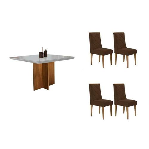 Sala Jantar Mesa Berlim Tampo c/ Vidro Curvo 90cm+4 Cadeiras Pietá Madeira Naturale/Off White - Capuccino/Suede Capuccino - Rufato