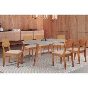 Sala Jantar Mesa Havana Tampo c/ Vidro Curvo 180cm+6 Cadeiras Havana Naturale/Off White - Suede Creme - Rufato