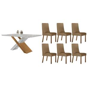 Sala Jantar Mesa Imperatriz Tampo c/ Vidro Curvo 180cm+6 Cadeiras Dakota Madeira Naturale/Off White - Capuccino/Linho Bege - Rufato