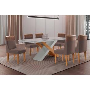 Mesa: Estrutura em MDF, Pés em MDF, Tampo em MDF com vidro temperado. Cadeira: Estrutura em madeira, Assento e Encosto estofados em Suede Marrom/Corano Capuccino.Vendido e entregue por Costa Rica Colchões