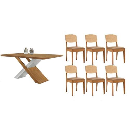 Sala Jantar Mesa Imperatriz Tampo Curvo 180cm+6 Cadeiras Havana Naturale/Off White - Linho Bege - Rufato