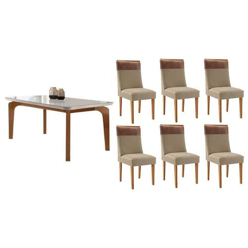 Sala Jantar Mesa Londrina Tampo c/ Vidro Curvo 180cm+6 Cadeiras Jaspe Madeira Naturale/Off White - Capuccino/Linho Bege - Rufato