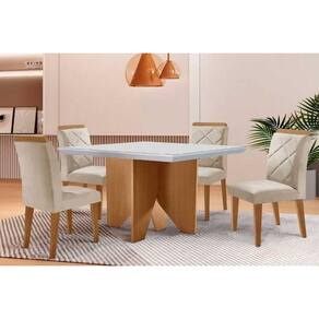 Sala Jantar Mesa Nevada Tampo c/ Vidro Curvo 90cm+4 Cadeiras Pietá Madeira Naturale/Off White - Suede Creme - Rufato