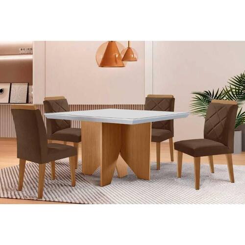 Sala Jantar Mesa Nevada Tampo c/ Vidro Curvo 90cm+4 Cadeiras Pietá Madeira Naturale/Off White - Suede Marrom - Rufato