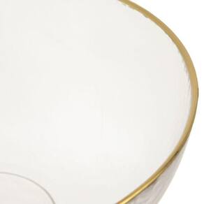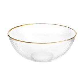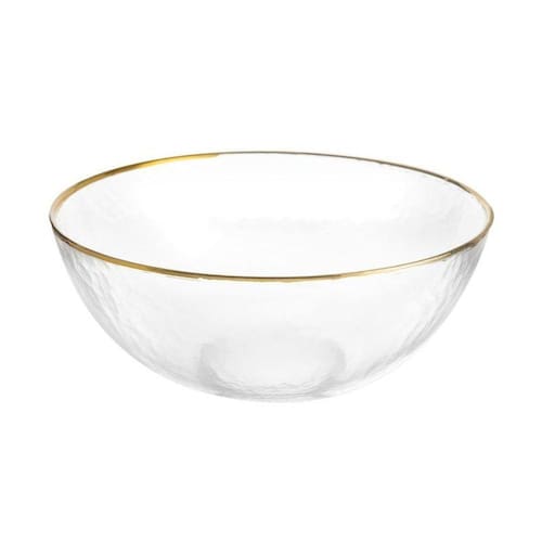 A saladeira Lyon possui 25 cm de diâmetro e 2700 ml de capacidade, é produzida em vidro transparente com textura canelada e filete dourado na borda.