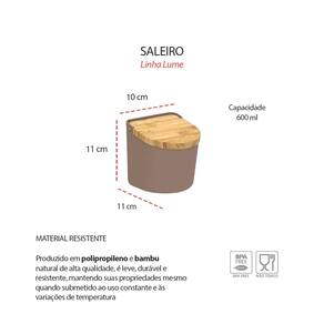 O saleiro da linha Lume traz praticidade e elegancia para o dia a dia na cozinha. Ideal para deixar na bancada, possui tampa basculante em bambu que protege o sal da umidade e facilita o uso. Seu design moderno combina bambu natural com plastico fosco resistente, oferecendo um toque de aconchego e sofisticaçao. O pote arredondado facilita a limpeza, garantindo higiene e durabilidade. Perfeito para armazenar e ter o sal sempre a mão.