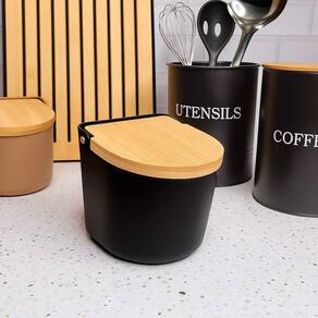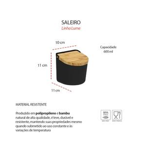 O saleiro da linha Lume traz praticidade e elegancia para o dia a dia na cozinha. Ideal para deixar na bancada, possui tampa basculante em bambu que protege o sal da umidade e facilita o uso. Seu design moderno combina bambu natural com plastico fosco resistente, oferecendo um toque de aconchego e sofisticaçao. O pote arredondado facilita a limpeza, garantindo higiene e durabilidade. Perfeito para armazenar e ter o sal sempre a mão.