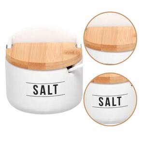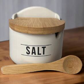 Saleiro de Cozinha de Porcelana Branco Premium Salt 290ml com Tampa e Colher de Bambu