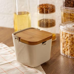 Saleiro em cerâmica tradicional tampa bambu e colher 10,5cm O saleiro com tampa em bambu vai ajudar a deixar sua cozinha mais organizada e preparar os seus alimentos com mais praticidade, além de ser uma peça decorativa linda. Produzido em cerâmica, já vem com a colher e tem capacidade para cerca 400ml, podendo ser para sal, alho ou tempero de sua preferência. Características do produto Material: cerâmica e bambu Dimensões axlxp : 10 x 10,5 x 10,5 cm Capacidade aproximada: 400ml Imagens ilustrativas e dimensões aproximadas, os demais produtos não acompanham o item. As cores podem variar de acordo com a tela do celular ou computador. Itens inclusos: 1 saleiro 1 colher Limpeza e conservação Não usar abrasivos e produtos químicos como removedores de gordura, água sanitária, limpa vidros. Lavar com detergente neutro, esponja macia e secar imediatamente. Não lavar em máquina de lavar louça. Marca: Não Informado