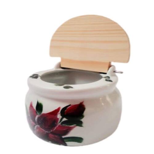 Saleiro de porcelana de parede, capacidade para 1 000 gramas artesanalmente decorado com flores e frutas, tampa de madeira de reflorestamento.