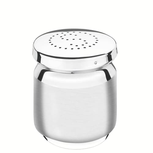 - Este Saleiro totalmente em Aço Inox com tampa perfurada no formato de S, além de facilitar a saída do ingrediente, já mostra o que contém no recipiente.