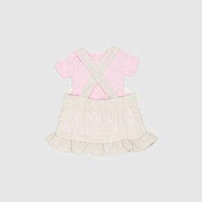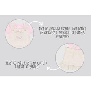 O body (P ao G) possui abertura de gola em transpasse estilo americano e abertura entrepernas por botões de pressão. A camiseta (1 ao 3) possui abertura de gola em transpasse estilo americano. A salopete possui abertura na alça frontal com botões amadeirados, detalhe de babado e elástico na cintura para ajuste da peça. O conjunto é muito confortável e garante o bem-estar do seu bebê.