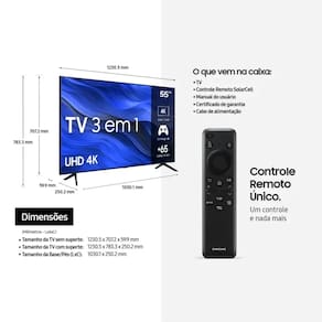 "O processador Crystal 4K transforma tudo a que você assiste em resolução próxima à 4K.A nova plataforma de games dentro da TV garante acesso a mais de 1000 jogos nas plataformas Xbox Game Pass e Nvidia GeForce Now, sem necessidade de downloads ou de consoles, além de recomendar conteúdos,transmissão de lives via Twitch e agrupar tudo sobre jogos em uma só interface.Assista os seus conteúdos em uma exclusiva tela sem bordas aparentes, e elimine a confusão de cabos com a solução de canaletas que permite organizar os fios e escondê-los.Acesso rápido aos seus apps e conteúdos favoritos com experiência otimizada de pesquisa, que sugere conteúdos com base em como você usa sua TV.Desfrute de uma imagem mais natural e detalhada com essa tecnologia inovadora, que analisa as regiões da tela e ajusta automaticamente o contraste.O HDR aumenta o alcance dos níveis de luz na sua TV, proporcionando mais brilho, contraste e detalhes para você aproveitar o seu programa favorito tanto nas cenas mais escuras, quanto naquelas de alta luminosidade.Surpreenda os seus adversários dominando a partida em uma TV que proporciona mais fluidez a cada cena.A experiência do som 3D permitirá que você fique totalmente imerso no áudio dos seus filmes e séries, como se estivesse no meio da ação junto da imersão do som da soundbar somada aos alto-falantes da TV.Avalia automaticamente os ruídos do ambiente e calibra o som da sua TV para uma experiência sonora potencializada.Controle e monitore toda a sua casa. Acesse o aplicativo SmartThings e transforme sua TV em uma central de automação controlando demais aparelhos inteligentes ou criando programações de acordo com a sua rotina. Além disso, aparelhos mais antigos, como seu ventilador com controle remoto, são detectados automaticamente e controlados pela TV.Encoste seu smartphone Samsung na TV e veja o conteúdo do seu celular automaticamente espelhado na tela grande para compartilhamento de fotos, vídeos e apresentações.Entretenimento para todos os gostos! Escolha entre uma variedade de mais de 60 canais de notícias, filmes, séries, novelas, infantis, lifestyle e mais. Sem assinatura, nem pagamento. Basta ligar a TV.Controle sua TV por voz em português: acesse apps, mude de canal ou altere o volume. A TV traz Bixby e Alexa integrados para você escolher o seu serviço de voz preferido.Intensificamos o nosso compromisso sustentável desde o processo de produção, utilizando material reciclável e reduzindo a emissão de carbono e o desperdício de papel, tinta e grampos, além de oferecer uma solução criativa e usual para a casa, já que as caixas dos produtos viram utensílios ou objetos decorativos. Além disso, o controle remoto SolarCell, agora ainda mais compacto, é feito de quase um terço de plástico reciclado dos oceanos e é recarregável por energia solar, luz ambiente e ondas de radiofrequência, evitando o desperdício de milhões de pilhas no meio ambiente."