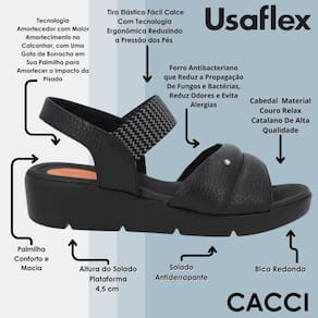 A Sandália UsaFlex tem seu cabedal em couro relax catalano e possui seu diferencial que é o detalhe em elástico na parte superior dos pés trazendo firmeza aos pés. Trás um fácil calce adptável ergonimicamento e reduz a pressão nos pés.