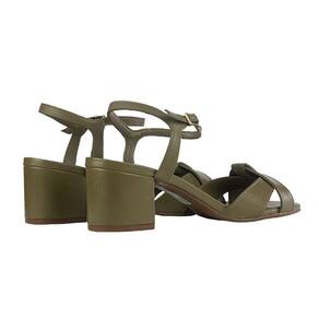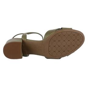 Sandália com salto bloco e bico levemente quadrado. O modelo possui duas tiras cruzadas e fechamento em fivela.