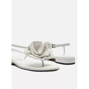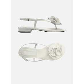 Descrição: Sandália branca de couro. O modelo tem salto baixo bloco e bico redondo. Traz tiras de suporte nas laterais e tira única que passa em torno do calcanhar, sobre o peito do pé e entre os dedos, com aplicação de flor grande de couro. Aberta, a sandália exibe todo o pé.