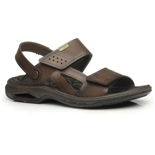 Sandália Masculina Pegada Essa sandália é fabricada em couro, matéria prima de alta qualidade, resistência e durabilidade. O solado é leve e flexível, e conta ainda com o sistema de amortecimento AMORTECH, através de tubos que absorvem o impacto na região do calcanhar. A palmilha é anatômica feita em eva que se adapta ao formato do pé com massageadores triangulares. O modelo ainda possui tiras em tiras autocolantes ajustáveis que facilitam o ajuste no pé.