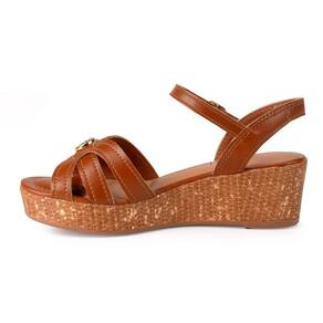 Com um design que nunca sai de moda, esta sandália apresenta um imponente salto anabela de 5,5 cm, inteiramente revestido com um material tramado que remete à elegância natural do estilo espadrille. A tira única e larga sobre o pé valoriza o visual, enquanto a cor caramelo, um clássico absoluto, garante combinações fáceis e sofisticadas.