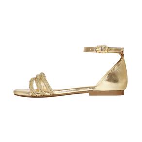 Linha de Rasteira Luiza Sobreira, produzida em material sintético metalizado na cor dourada com detalhes em strass, bico redondo, com palmilha em espuma ergonômica e forro em P.U., solado em TR.