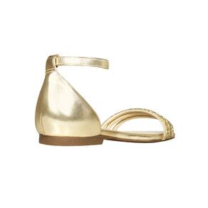 Linha de Rasteira Luiza Sobreira, produzida em material sintético metalizado na cor dourada com detalhes em strass, bico redondo, com palmilha em espuma ergonômica e forro em P.U., solado em TR.
