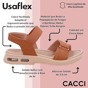 A sandália Usaflex foi desenvolvida para proporcionar o máximo de conforto e bem-estar em cada passo. Seu design anatômico e tecnologia adaptável reduzem a pressão nos pés, oferecendo uma sensação leve e ergonômica durante todo o uso. O calce facilitado permite praticidade e segurança, ideal para quem busca funcionalidade no dia a dia sem abrir mão da elegância.