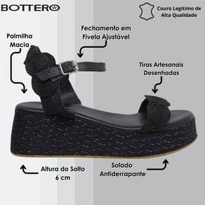Conheça a Sandália Anabela em couro atanado da Bottero. De solado Anbela todo revestido em linhas com aplicações de brilhos com uma altura de 6 cm e antiderrapante trazendo todo o conforto e beleza que você precisa, acompanha uma palmilha macia e mega confortável fazendo com que seus pés caminhem com mais tranquilidade. Sua parte Traseira é aberta com tira toda trabalhada com linhas e desenhos artesanais e um fechamento ajustável de metal onix. Possui sua tira frontal também desenhada artesanalmente tiras finas que transpassam sobre o pé danto total luxo e modernidade ao calçado. Vá para todos os lugares com ela e combine looks incríveis, você irá amar!