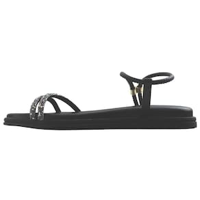 Com um design que equilibra feminilidade e modernidade, a sandália apresenta delicadas tiras adornadas com detalhes em strass estrategicamente posicionados. Esses elementos conferem um toque de brilho sutil, adicionando glamour ao visual sem comprometer o conforto.