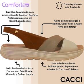 Descubra o equilíbrio perfeito entre conforto e estilo com esta sandália especialmente desenvolvida para uso diário. A construção em couro de alta qualidade garante durabilidade e resistência, enquanto o design proporciona leveza e praticidade em cada passo. O salto anabela com 6 cm oferece estabilidade ideal para o dia a dia sem abrir mão de elegância. A palmilha acolchoada confere amortecimento extra para máximo bem-estar durante horas de uso. As tiras largas com elástico oferecem ajuste prático e seguro, facilitando o calce e acomodando os pés com suavidade. A sola emborrachada antiderrapante promove segurança em diferentes superfícies.