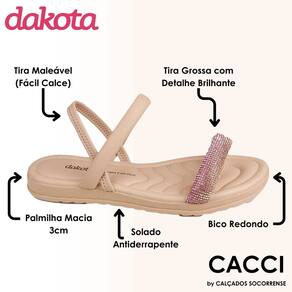 A Sandália Feminina Flat Dakota é confeccionada em material de alta qualidade com detalhes de strass no cabedal e acabamento em costura. Esse modelo possui palmilha em PU acolchoado e solado em borracha antiderrapante com 3cm de espessura.