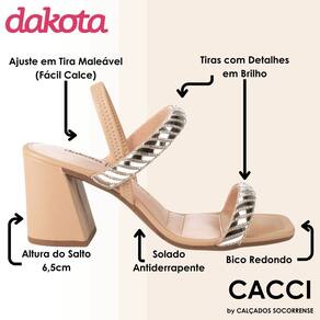 A Sandália Dakota de Salto Bloco é uma escolha elegante e glamorosa para diversas ocasiões. Com um salto bloco alto de 6,5cm, essa sandália oferece um toque de sofisticação e feminilidade ao seu visual. As tiras com brilhos na parte frontal proporcionam um charme especial, garantindo glamour às suas produções e tornando-a perfeita para momentos especiais.