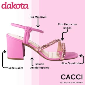 A Sandália Dakota de Salto Bloco é uma escolha elegante e glamorosa para diversas ocasiões. Com um salto bloco alto de 6.5cm, essa sandália oferece um toque de sofisticação e feminilidade ao seu visual. As tiras finas com brilhos na parte frontal proporcionam um charme especial, garantindo glamour às suas produções e tornando-a perfeita para momentos especiais.