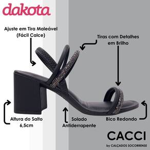 A Sandália Dakota de Salto Bloco com Brilhos é elegante e prática para diversas ocasiões. Feita com tiras finas delicadamente envolvendo o pé, chama atenção especialmente pelas tiras com brilhos, que conferem um toque sofisticado. Além de seu apelo estético, essa sandália também oferece conforto e praticidade, graças à tira elástica sem fechamentos que envolve o calcanhar. Fabricada com material sintético de alta qualidade, alia durabilidade e estilo.
