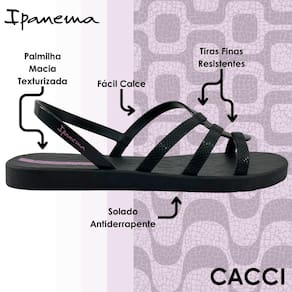 A assimetria é uma tendência no mundo fashion e que deixa o pé feminino e delicado. O mix de polido e texturizado entrega ainda mais valor a sandália. A sola traz a textura da calçada de Ipanema reinterpretada e que segue na lateral da sola, uma super novidade no ponto de venda.