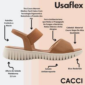 Sandália UsaFlex feito de material em Napa de alta qualidade, modelo possui tecnologia facil calce com uma tira de couro possuindo elástico com tecnologia ergonomica que reduz a pressão dos pés. Seu forro inteligente Antibacteriano que reduz a propagação de fungos e bactérias, odores e também evita quaisquer alergias. Palmilha conforto sendo anatômica e macia encaixando perfeitamente aos pés.