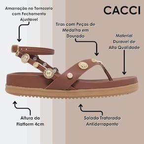 Descubra o equilíbrio perfeito entre estilo e conforto com nossa sandália flatform Cacci, uma combinação perfeita entre moda e conforto. Com um design moderno, ela oferece uma opção versátil para quem busca praticidade sem perder o charme.