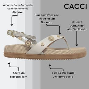 Descubra o equilíbrio perfeito entre estilo e conforto com nossa sandália flatform Cacci, uma combinação perfeita entre moda e conforto. Com um design moderno, ela oferece uma opção versátil para quem busca praticidade sem perder o charme.