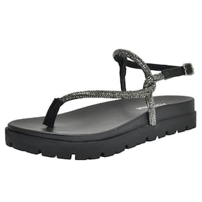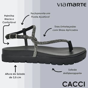 A sandália rasteira papete flatform vem com um solado flatform revestido por um tramado de tiras delicadas, e sua palmilha anatômica garante conforto ao caminhar. Uma tira revestida de strass envolve o pé, adicionando um toque de brilho. O calcanhar é envolvido por tiras com fechamento prático na lateral, completando o design elegante e seguro desta sandália.