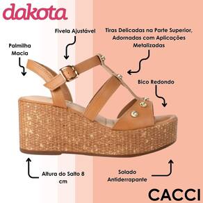 A Sandália Dakota Anabela é o modelo perfeito para quem busca elegância e conforto em um único calçado. Com design moderno e toque artesanal, ela se destaca pelo salto de 8 centímetros em estilo plataforma, que garante estabilidade e alonga a silhueta de forma natural. O visual é complementado pelas tiras delicadas com aplicações metalizadas, que trazem brilho sutil e sofisticação ao look.