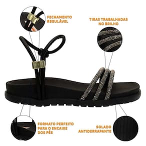 Confeccionado em tiras com strass, modelo super moderno e despojado. Possui palmilha com encaixe perfeito para os pés e o solado antiderrapante.