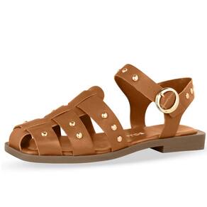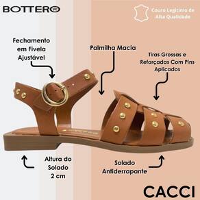 Sandália Pescadora em couro atanado. De solado rasteiro com palmilha macia e confortável com seu solado antiderrapante com saltinho de 2 cm de altura. O modelo possui tira larga central sobre o pé e tiras largas na horizontal, exibindo parte do pé. Possui traseiro aberto com tira ajustavel e fechamento prático de metal dourado.
